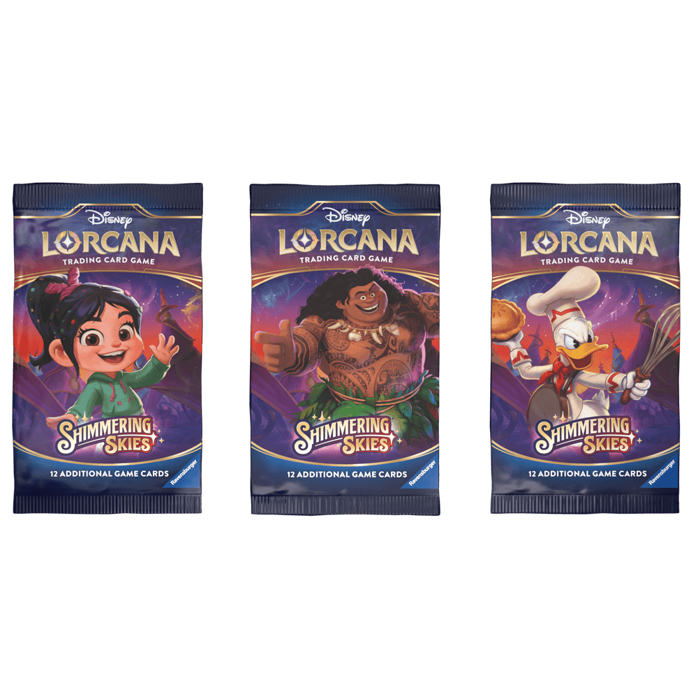 Cada pacote consiste em 12 cartas com uma mistura de cartas comuns, incomuns, raras, super raras e lendárias, incluindo uma carta foil aleatória - cada carta em Disney Lorcana